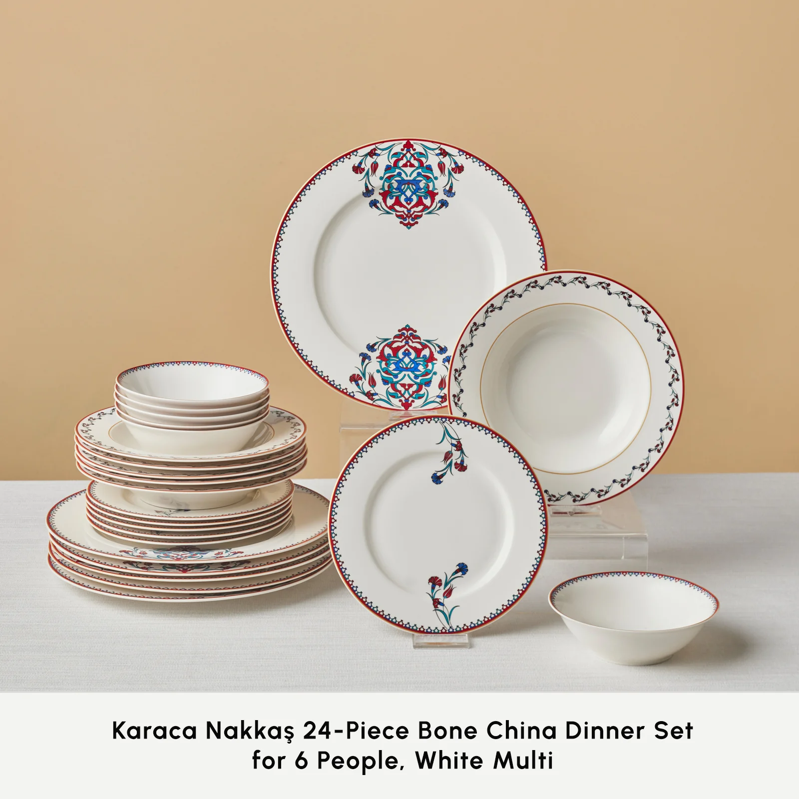 Karaca Nakkaş 24-Piece Bone China Dinner Set for 6 People, White Multi