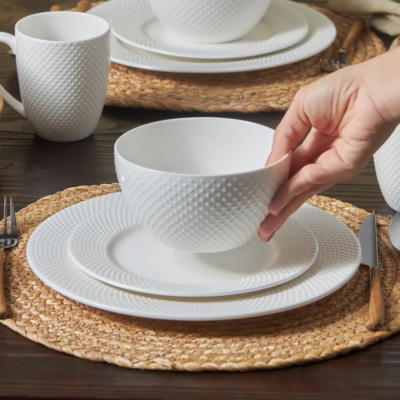 Karaca Punto Embossed 16-Piece Bone China Dinner Set for 4 People, White