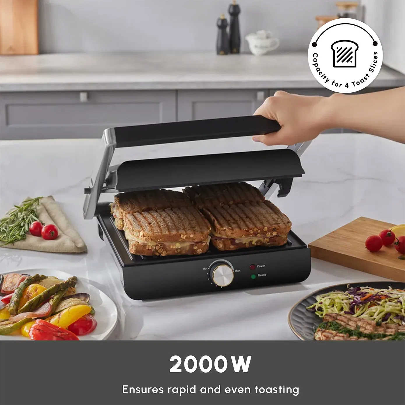 Experience versatile cooking with this grill and sandwich toaster, perfect for a wide range of culinary creations from crispy sandwiches to succulent grilled meats.