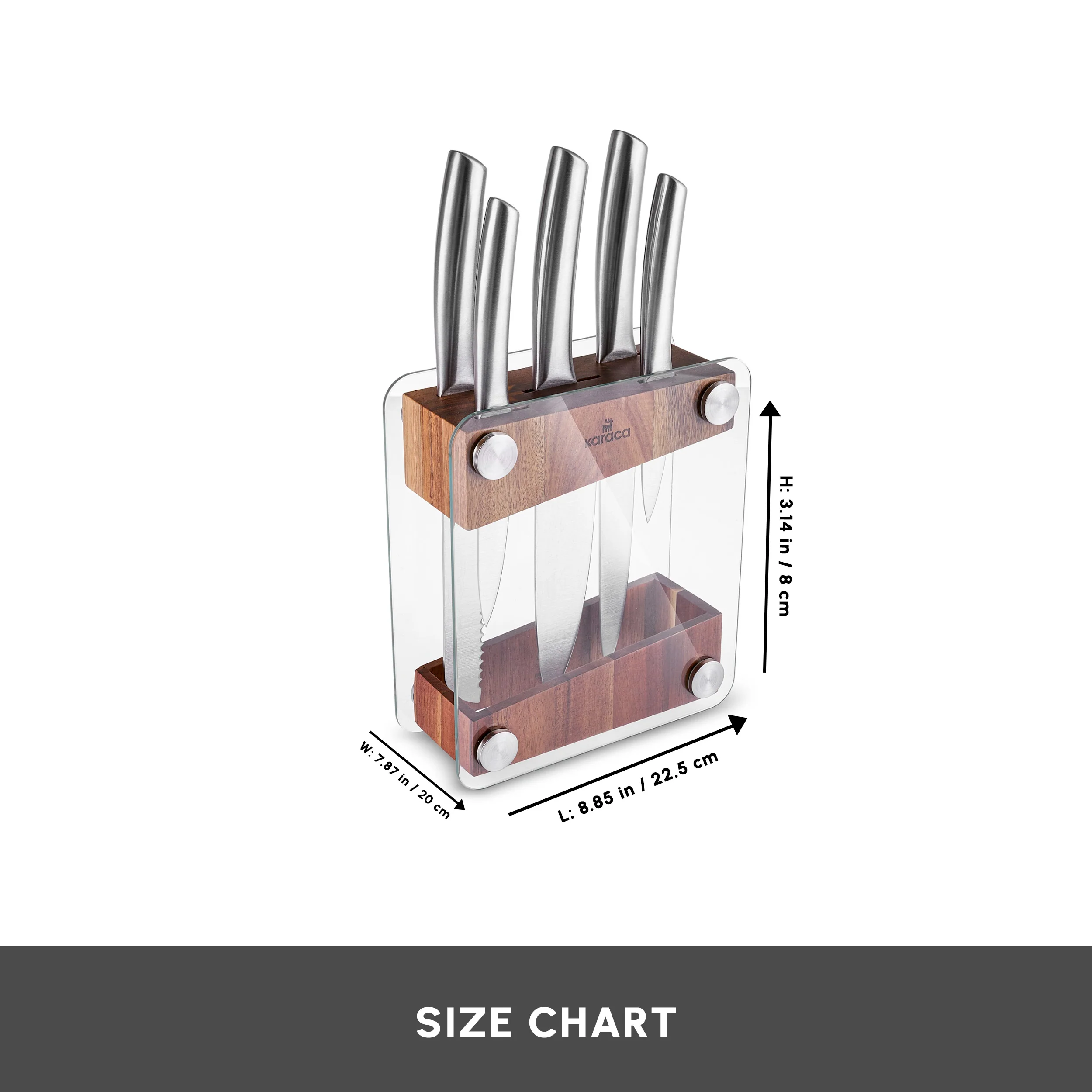 Karaca Venus Knife Set has 5 blade models, each more beautiful and sharp than the other, including paring, carving, utility, boning and chef's knives. This set, which offers a healthy and durable use thanks to its stainless steel composition. Your knife set, which offers an ideal use with its sharp knives and stylish stand that will save space, will be a guest in your kitchen for many years with its stainless steel knives!.
