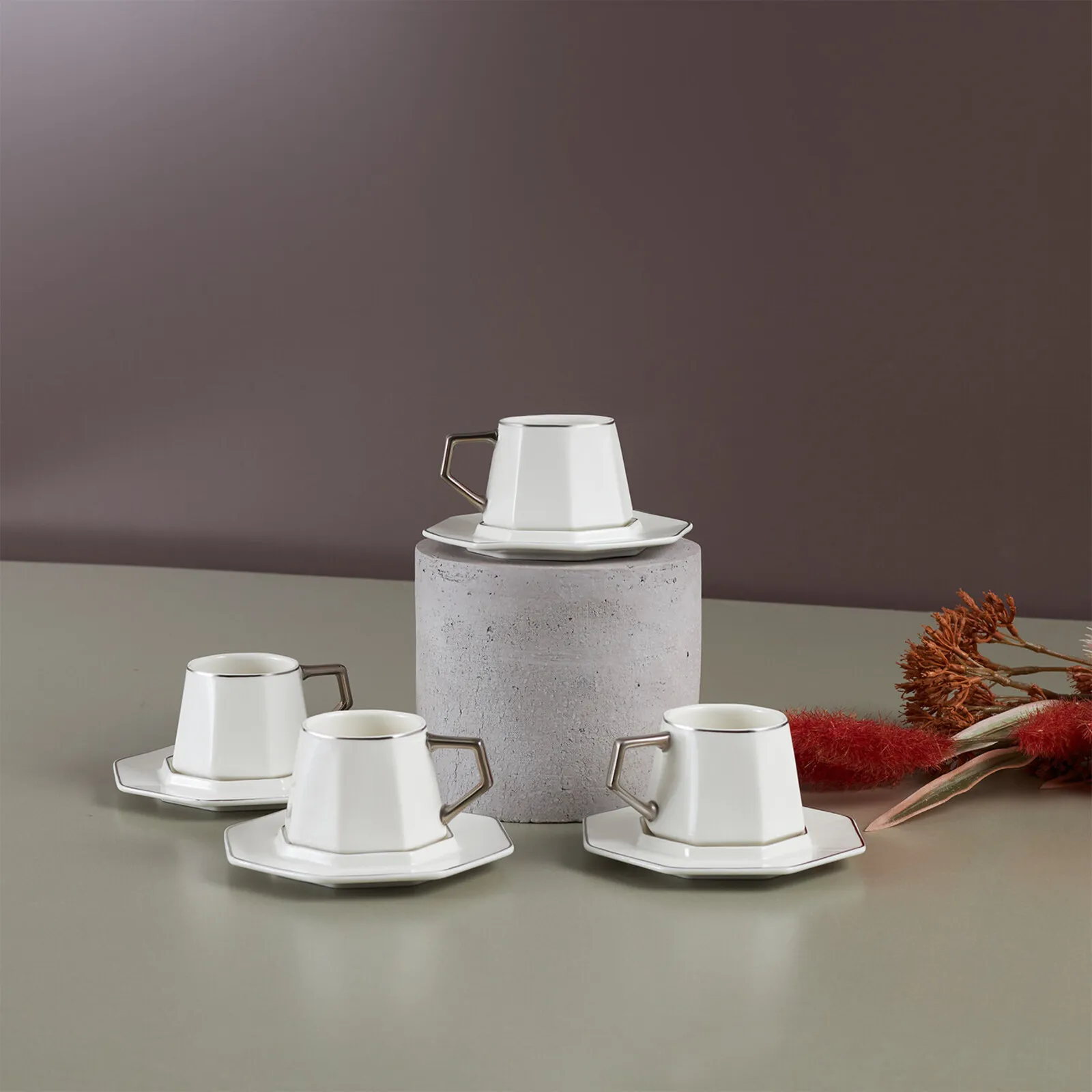 Karaca Zeher 12-Piece Porcelain Espresso Turkish Coffee Cup Set for 6 People, 90ml, White Silver