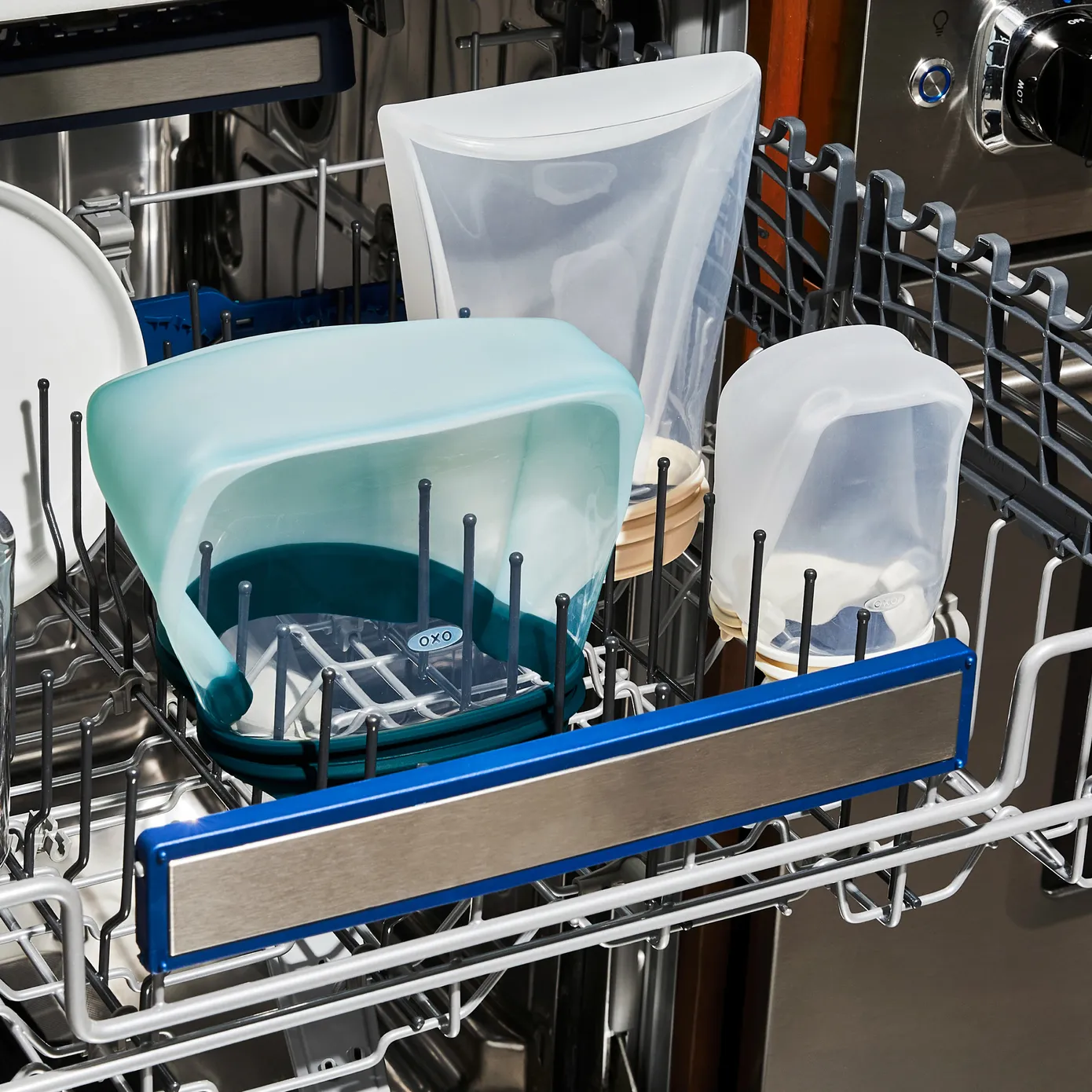 A new take on keeping food fresh at home or on the go that’s kinder to the planet too. Our OXO Good Grips Reusable Silicone Bag assortment replace single-use plastic and is so durable, versatile and easy to clean, they will quickly become your new go-to solution for better food storage. The flat size bags are easy to stack in the fridge or freezer for compact storage, and slip easily into totes and backpacks for on-the-go needs. The standing bags sit upright, making them a perfect companion for grazing snacks or use them to reach in and out while measuring out dry ingredients such as nuts and chocolate chips will baking. Each bag is made of food-grade silicone with a seamless construction. What does that mean? No seams make them more durable and the bags can easily be turned inside out for thorough cleaning. Pop them in the dishwasher or wash by hand to effortlessly scrub away any rogue, stuck-on food bits hiding in the corners or on the seal. Our Reusable Silicone Bags also have a unique dust-resistant finish to help repel unwanted dust and debris from sticking to the surface. This helps keep your bags clean and also give them feel good texture that’s comforting when fumbling around for them in a work tote, gym bag or backpack. What’s more, our Reusable Silicone Bags each have a secure closure to keep food fresh and prevent leaks, so you can feel confident toting your juicy pineapple, watermelon or a brothy pasta to work or marinating kabobs in the fridge without worry. The closer has a generous-sized tab for easy opening and closing and the bags open wide for fumble-free filling. Available in a variety of sizes and in our Oat, Lagoon and Watermelon colors, our Reusable Silicone Bags are designed to suit all your food storage needs and beyond. Use them to store foods at home or taking lunch and snacks on the go or use them to reheat leftovers—they are both microwave safe. The Half Gallon and Gallon bags are great for use with sous vide recipes, sealing in all the flavor and ingredients while cooking. These versatile bags are great beyond food too! We love them for toting and storing travel and makeup essentials. Load them up with your passport, cell phone charger, sleep mask and chewing gum for your next plane trip or pile in your post-workout essentials like face wipes, deodorant, hair ties and makeup. With so many sizes and uses, the possibilities are endless! Available in five flat sizes: Snack Bag (12 oz); Sandwich Bag (28 oz); Slim Bag (30 oz): Half Gallon Bag (64 oz); and Gallon Bag (128 oz and four stand-up sizes: Snack (12 oz); Stand-Up Quart (32 oz): Stand-Up Half Gallon (64 oz); Stand-Up Cup (8 oz). Also available in two sets: 4-Piece Lunch Set and 4-Piece Starter Set.